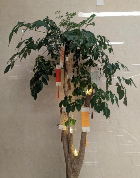 活动包括填祝福、送吉祥和圈中快乐三个环节。参加祝福活动的同学们在领取义工站提供的书签后,将自己的祝福写在了书签上。无论是节日祝福、国庆祝福、校庆祝福还是个人生活中的祝福,都是同学们对于美好未来的期待和憧憬。每一份祝福书签都在大厅里得到了展示,在小夜灯的照亮下,在盆栽树的装饰下,每份祝福都熠熠生辉。