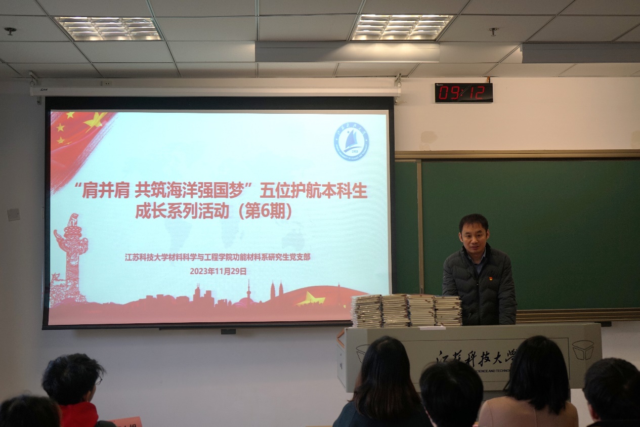 为切实开展“我为群众办实事”实践活动,构建全员育人大格局,推动学院学风建设工作,121日,材料学院在文理大楼举办了“肩并肩,共筑海洋强国梦”五位护航本科生成长系列活动(第六期)。材料学院党委书记李瑞峰、党委副书记杨海涛、辅导员刘志红、刘珣等出席活动,功能材料系研究生党支部全体党员、积极分子、受护航学生参加活动。活动由赵田园主持。
