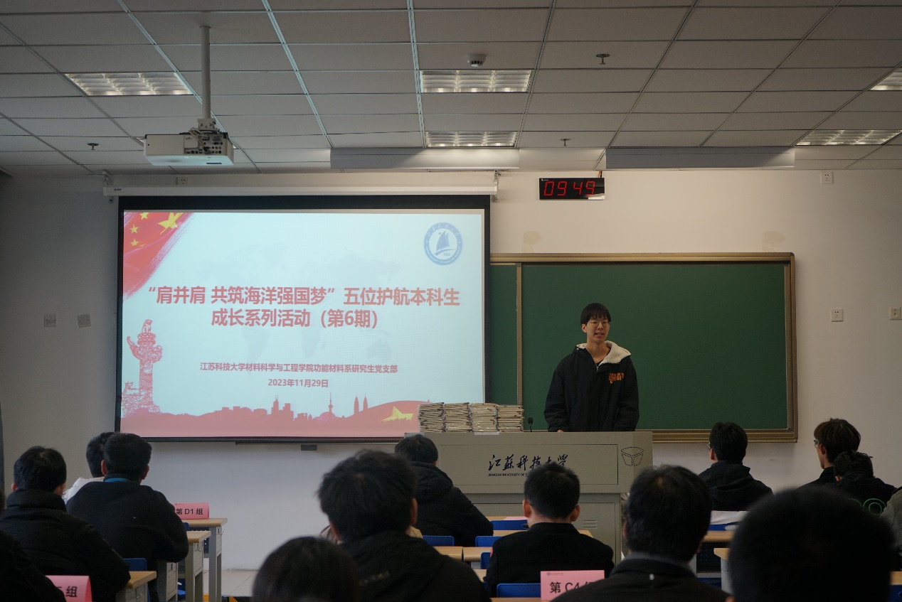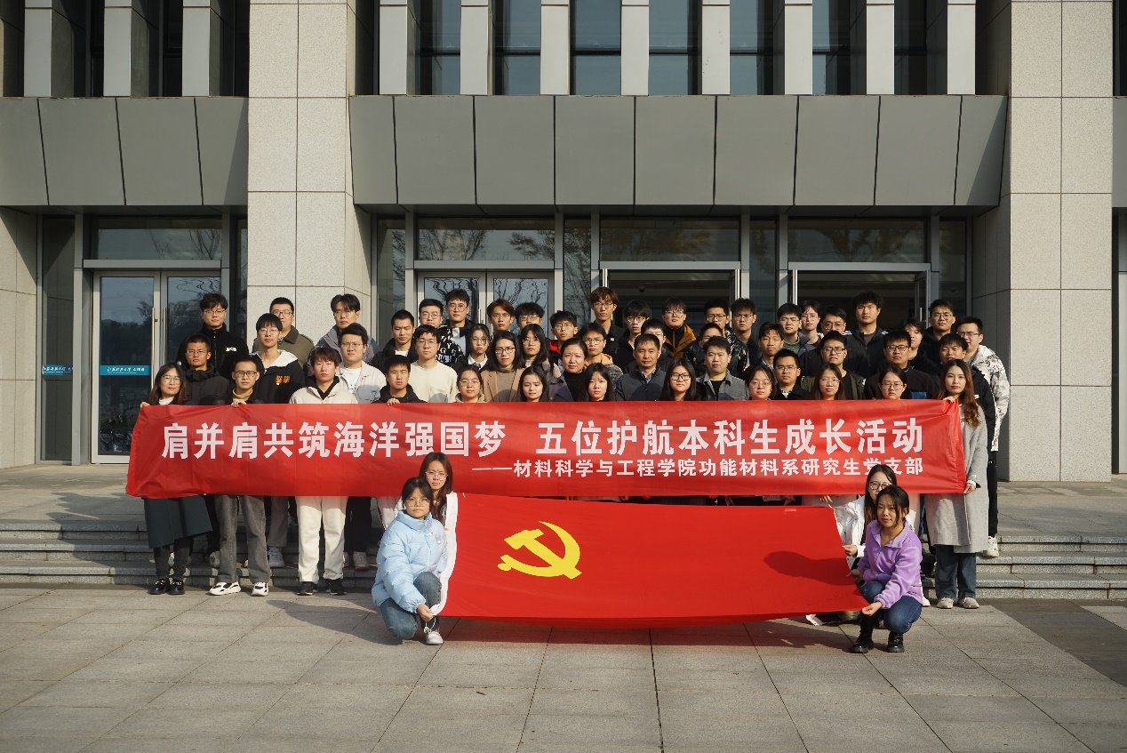12月1日,材料学院在文理大楼举办了第六期“肩并肩,共筑海洋强国梦”五位护航本科生成长活动。材料学院党委书记李瑞峰、党委副书记杨海涛、辅导员刘志红、刘珣,功能材料系研究生党支部全体党员、积极分子、受护航学生参加活动。活动由党支部副书记赵田园主持。