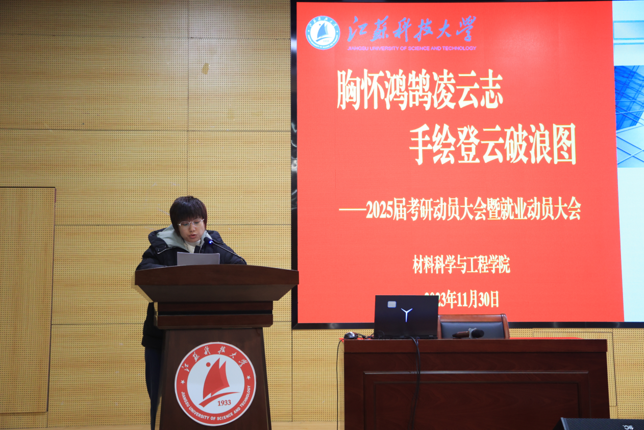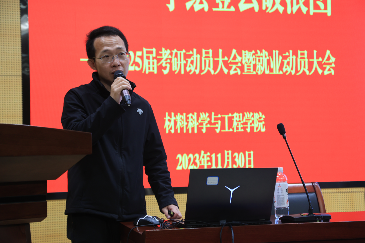为更好地指导同学们作好学业规划,有意识地开展考研和就业准备工作,11月30日下午,材料学院在长山校区图书馆105报告厅召开2025届考研就业动员大会,引航学生成长。山东大学陈姬教授、哈尔滨工业大学初冠南教授、天津大学马哲教授、江苏科技大学胥国祥教授、二重(镇江)重型装备有限责任公司资深人力资源管理经理章婕、材料学院党委副书记杨海涛,辅导员刘志红、张正栋、涂亦凡与2021级全体学生参加会议。会议采用线上线下相结合的方式进行,由杨海涛主持。