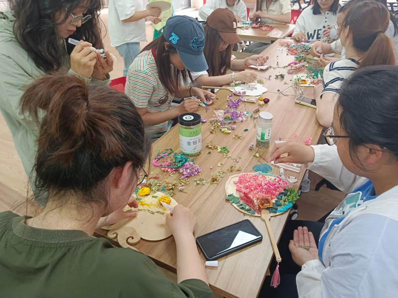 空白扇卷,静待药香,以药为笔,舞扇逐梦。活动现场,参与活动的同学精心挑选了自己心仪的扇形,充分发挥想象力和创造力,使用白术、决明子、黄柏、陈皮等各类中草药材料,结合一些花草制作出一把把独具特色的中草药团扇。除了团扇的制作,不少同学还DIY了各类中草药系列心“晴”配饰,如中草药胸针、耳坠等。每一件作品都凝结了制作者的用心与创意,为炎炎夏日增添了一抹清凉。
