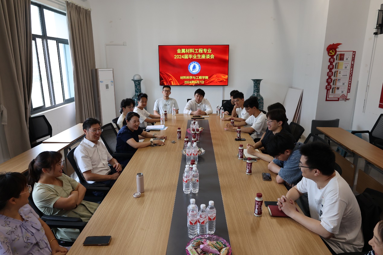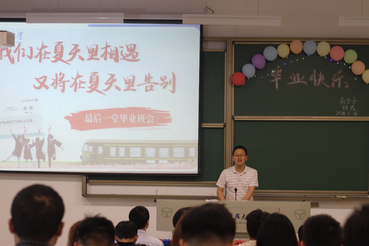 担忧,始终保持积极向上的心态,将“船魂”精神传递下去。下午,高分子、材料成型主题班会在笃学楼101教室举行,材料学院院长晏超,高分子系周海骏、施敏杰,材料成型系乔磊参加活动。晏院长深情回顾了自己作为学业导师和同学们朝夕相处的点点滴滴,真诚祝福2024届毕业生顺利毕业,前程似锦。66日,金属材料系主任陈洪美、功能材料系主任袁妍妍、材料成型系副主任臧千昊,以及学业导师张兴华、李洁老师共同参加三个专业的主题班会,为同学们送上祝福。