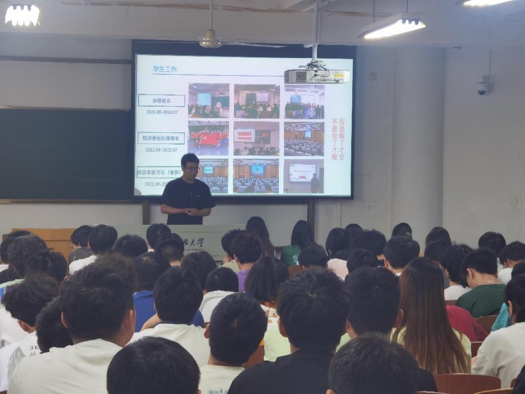材料学院23届材料成型专业的四名优秀校友给机械大类做了宣讲,他们分别是来自重庆大学的海宇航、武汉大学的向晨、北京航空航天大学的欧阳如亮、武汉理工大学的敖聪。四位校友首先给大家展示了23届材料成型专业上岸院校,并相继介绍了各自宝贵的经验、在高校读研的学习、科研和实践的点滴,让低年级的学弟学妹们心之所向。宣讲结束后,低年级的学弟学妹们就考研和读研生活等方面向五位学长提问,学长们耐心解答并祝愿学弟学妹们也能去到理想高校。
