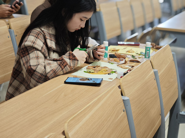 落叶如同时间的书签,标记着秋天这部绚烂篇章的尾声。11月16日下午,义工站组织同学们拾起校园内的秋叶,体会着来自大自然的温柔。在这场与秋叶的亲密对话中,同学们充分释放想象力与创造力,将一片片形态各异的落叶,巧妙地转化为一幅幅精美绝伦的剪贴画。这一创作过程,不仅培养了同学们的创新思维和动手能力,还让学子们的心灵在这份宁静与美好中得到洗礼,为校园增添一抹充满创意和自然气息的秋日风景。