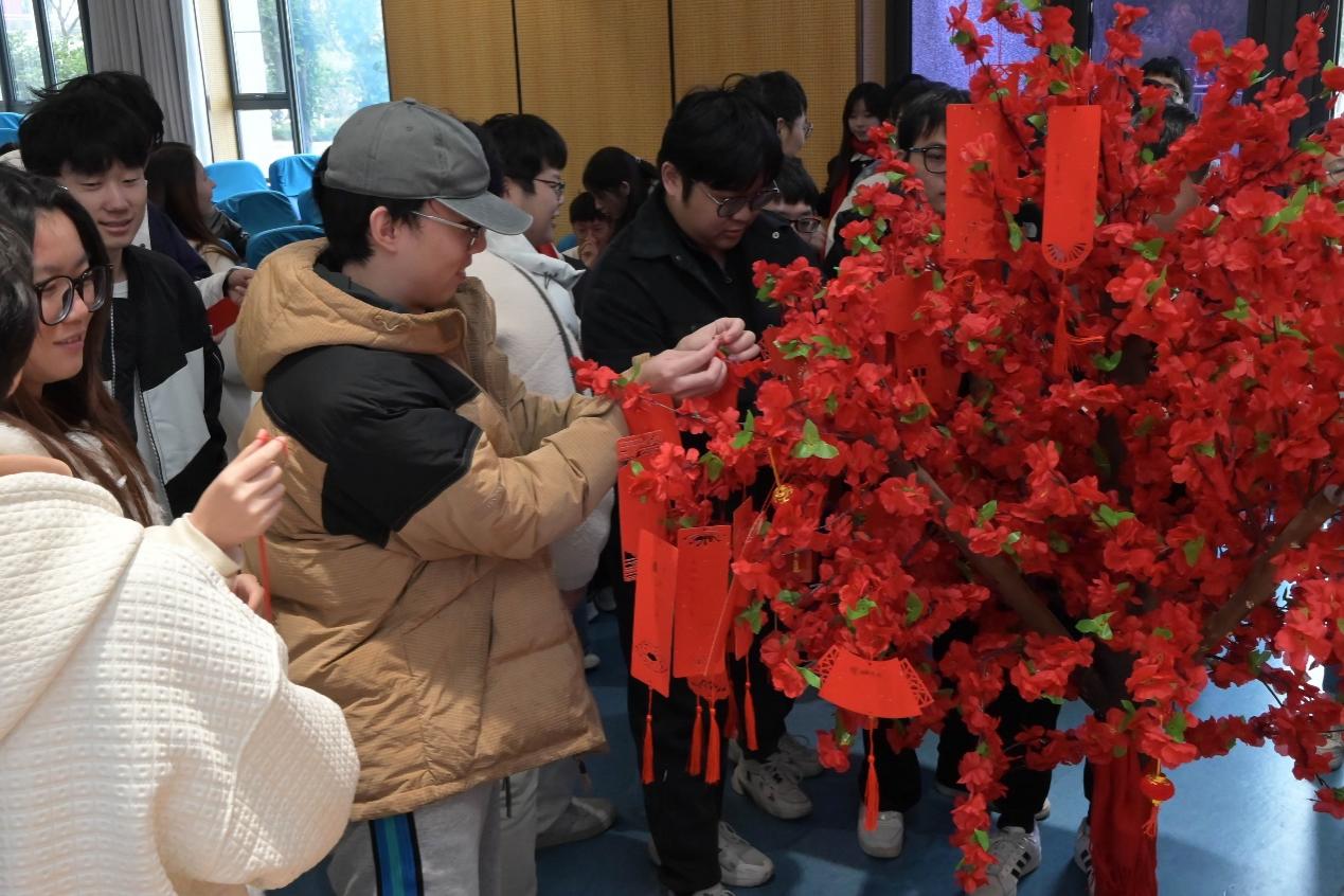活动现场还准备了暖心礼品,包括金榜题名奖、旗开得胜奖、一举夺魁奖和研定上岸奖,寓意“锦鲤附体”“柿柿如意”“喜事连连”。领奖前,同学们依次将手中刚刚写好的心愿卡挂在心愿树上,表达自己的心愿和祝福。随着老师们为每个同学佩戴寓意考研上岸的吉祥“红围巾”,现场氛围达到高潮。