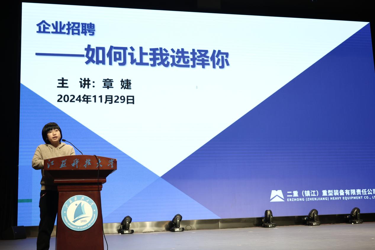 二重(镇江)重型装备有限责任公司的资深人力资源管理经理章婕经理从企业角度出发,剖析了当前就业形势,并就央国企的人才需求、优势等方面进行了详尽阐述,建议同学们通过秋招、春招等机会,多多了解企业招聘需求,再结合自身情况提前规划职业生涯。