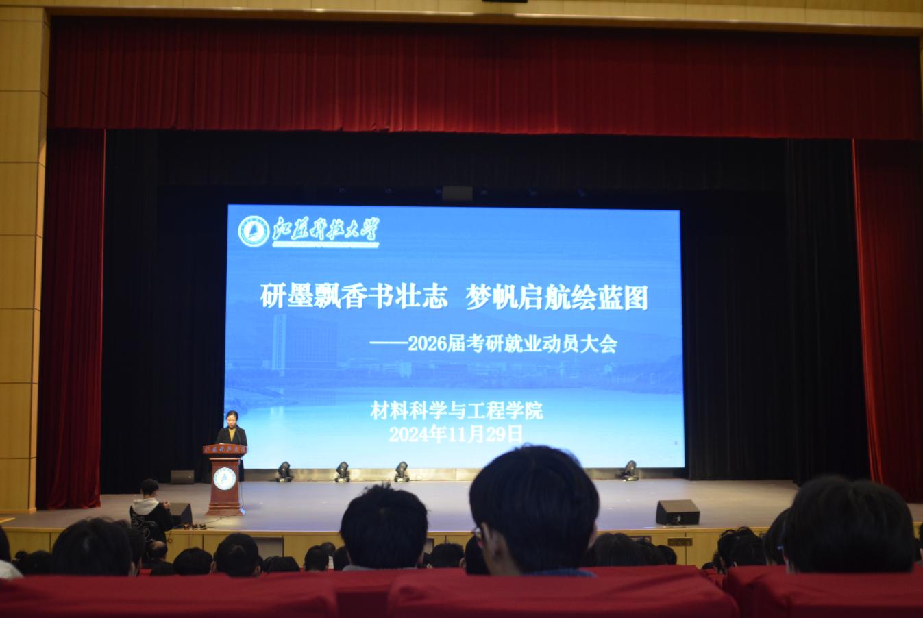11月29日下午,材料学院在长山校区船苑剧场隆重举办了2026届考研与就业指导大会,旨在为广大学子提供考研规划和职业发展的专业指导。本次大会特邀嘉宾有哈尔滨工业大学王廷教授、中山大学舒凤远教授、苏州大学蔡晓旭副研究员、江苏科技大学刘彬教授、二重(镇江)重型装备有限责任公司资深人力资源管理经理章婕、资深考研规划指导老师潘小跃。辅导员刘志红、刘珣、刘雨庭、曹天龙及2022级全体学生参与了此次大会,会议由学院党委副书记杨海涛主持。