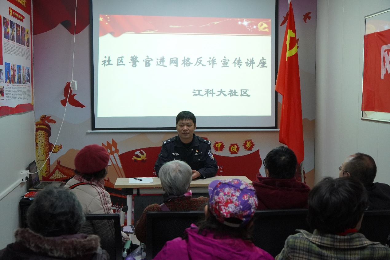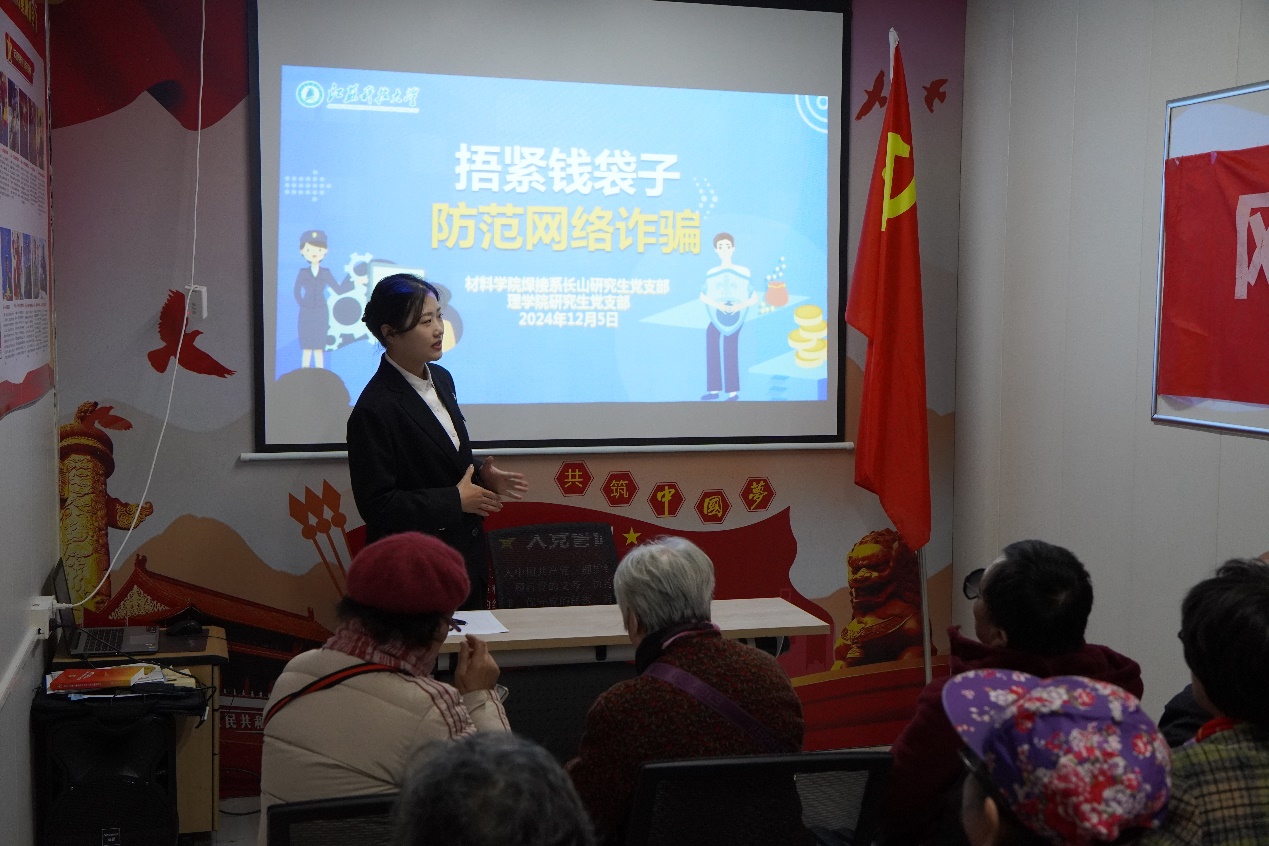 12月5日下午,江苏科技大学材料学院和理学院研究生党员们携手正东路派出所顾所长,走进江科大社区,组织开展了“捂紧钱袋子,防范网络诈骗”主题党日活动,通过知识问答、互动游戏等形式,为社区居民带来了一堂生动且实用的防诈骗安全课,提高市民在日常生活中的防诈骗意识和能力。