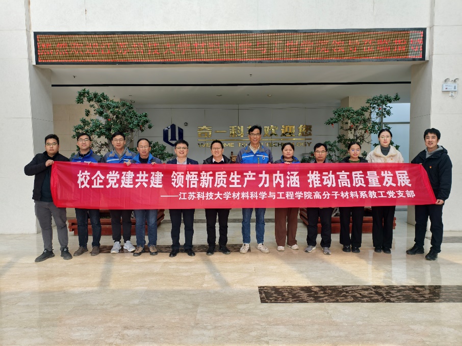 朱华平董事长首先对江苏科技大学高分子材料系教工党支部的到来表示热烈欢迎,并介绍了公司的发展历程、运营态势与当前聚焦的主要技术问题。晏超院长介绍了学院发展情况,并强调学院高分子材料与工程专业研究方向与奇一科技公司的产品特色高度契合。他认为,双方应共建共学、联合创新,共同优化人才培养培养机制,深度融合,共同发展。严学华团长高度肯定了本次活动的意义,他指出开展党建共建是贯彻落实习近平总书记关于党的建设的重要思想,提高高校党建质量的具体实践,未来的合作需建立健全工作机制,创新合作载体模式,通过丰富组织生活形式、搭建校企间的研究实训平台等方式,不断增强双方在科技创新、人才培养等方面的交流合作深度和广度。