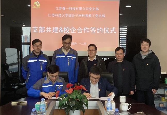 为推进党支部标准化规范化建设,加快实现高水平科技自立自强,并更好地践行党建与业务融合,深刻领悟新质生产力的基本内涵,推动校企双方高质量发展,2024年12月6日,材料科学与工程学院高分子材料系教工党支部与江苏奇一科技有限公司党支部签署了党建共建协议。学院党委副书记、院长晏超,江苏奇一科技有限公司董事长朱华平,高分子材料系教工党支部书记李照磊以及双方党支部党员代表出席了本次签约仪式。镇江市前沿新材料产业科技镇长团团长严学华见证了签约仪式。