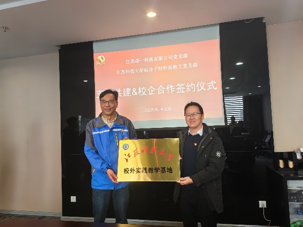 随后,双方党支部共同学习了习近平经济思想研究中心的《新质生产力的内涵特征和发展重点》一文。此次学习,不仅提升了双方党员的理论素养,也为校企合作指明了方向,促使双方对新质生产力的内涵有了更深刻的理解,为后续的合作项目选择和资源整合提供了重要的理论指导。在热烈的氛围中,高分子材料系教工党支部书记李照磊和江苏奇一科技有限公司总经理朱成卓共同签署了党建共建协议。最后校企双方举行了江苏科技大学校外实践教学基地的挂牌仪式。