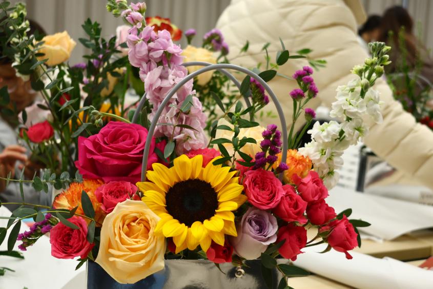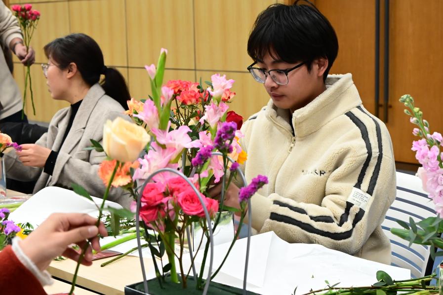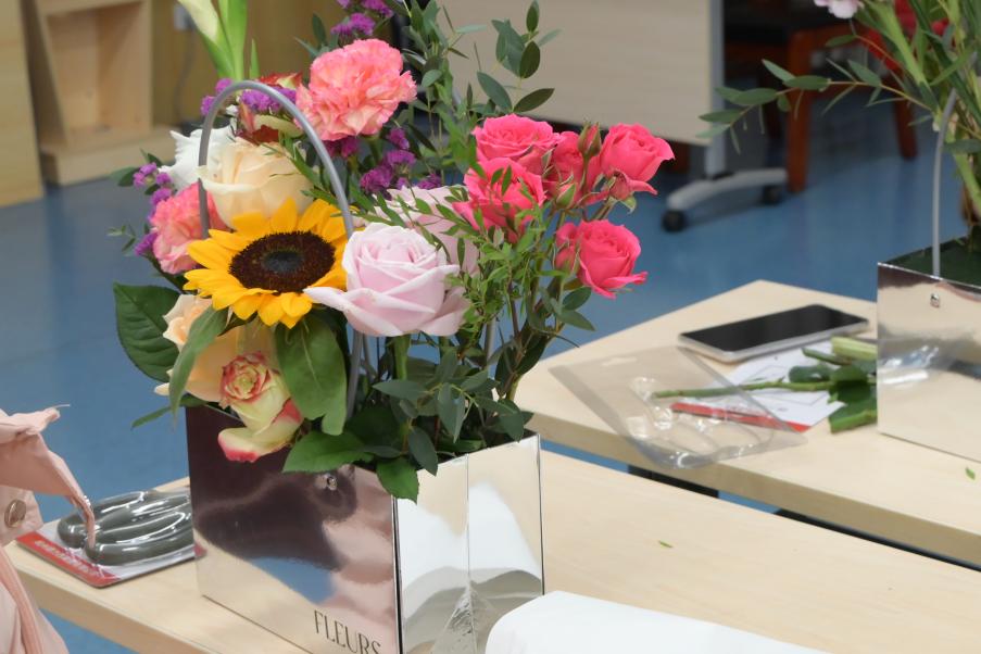 活动现场,各式各样的花卉和绿植琳琅满目,从经典的玫瑰、百合到现代感的干花,应有尽有。师生们在花艺老师的指导下,认真学习插花技巧,从修剪花枝、搭配色彩到构图设计,每一步都充满了创意与想象。