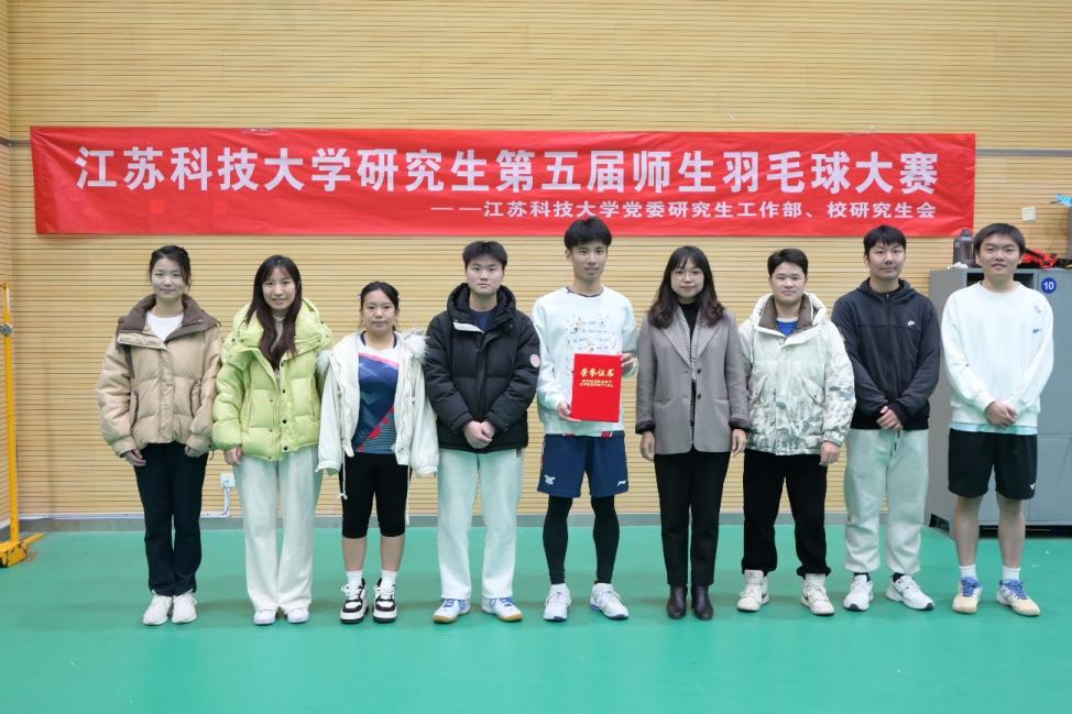 2024年12月16日,研究生第五届师生羽毛球大赛在江苏科技大学体育馆完美收官。经过多日激烈角逐,材料学院凭借卓越的团队协作与拼搏精神,最终斩获本次大赛的冠军。颁奖仪式在热烈的氛围中进行,研工部部长徐剑为获奖代表队及选手颁奖,选手们互相拥抱合影留念,共同庆祝这一来之不易的荣誉。