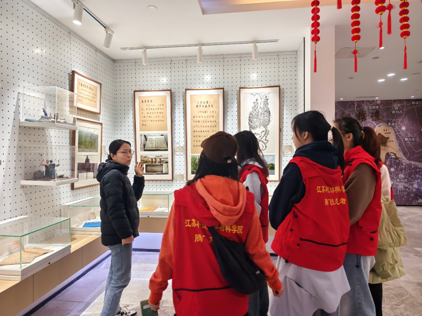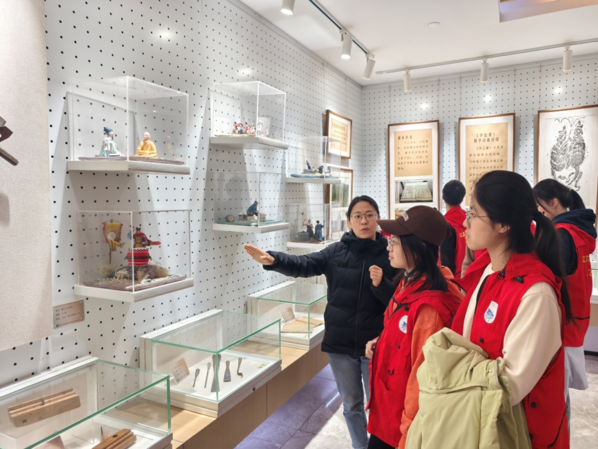 活动当日,在非遗保护中心讲解员的引导下,志愿者们依次参观了国家级非遗“镇江恒顺香醋酿制技艺”的百年醋坛,省级非遗“太平泥叫叫”的憨态泥塑以及市级非遗“铜板彩画”的流光溢彩。这些传统技艺的精湛工艺令学生们惊叹不已。省级非遗传统风筝更是引起了同学们的好奇,大家纷纷感慨:“第一次发现,一根竹条弯曲的弧度竟能决定风筝飞行的稳定性,传统手艺里藏着科学的智慧!”