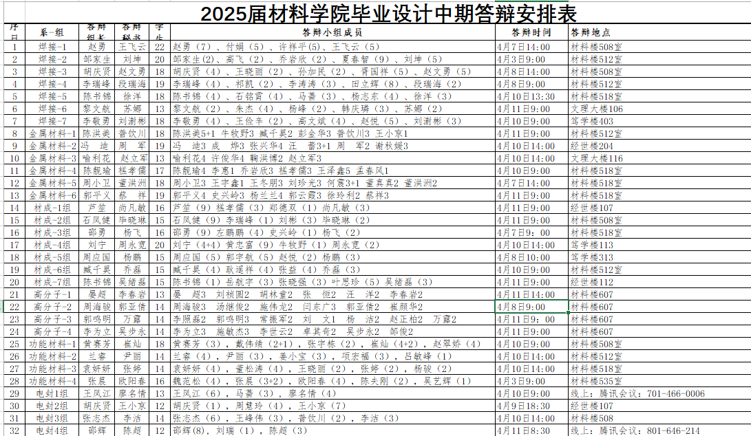以下是材料学院2025毕业设计中期答辩的具体安排: