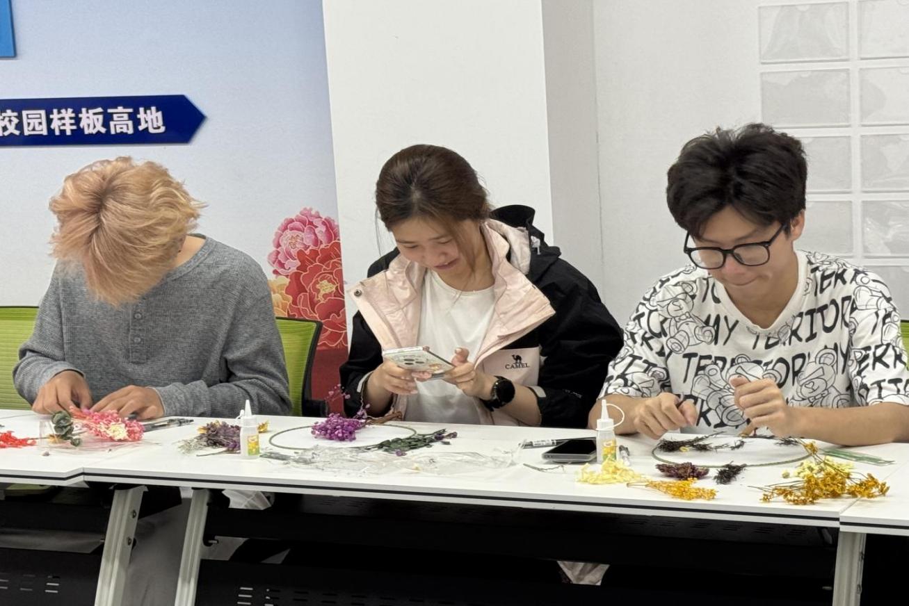 本次活动共分为三个部分。第一部分手工制作团扇,现场准备了素面团扇、干花、胶水等丰富材料,同学们发挥想象、细心粘贴花瓣,精心制作着属于母亲们的礼物,将浓浓的爱意融入方寸之间。活动现场欢声笑语不断,气氛格外活跃融洽,同学们互相交流创意,拍照记录制作过程,在协作中感受手作的温度。