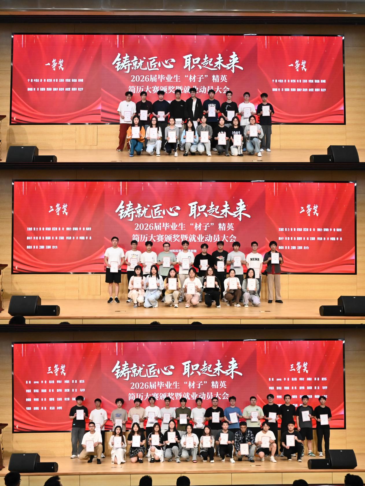 大会伊始,杨海涛副书记宣读了首届 “材子” 精英简历大赛获奖名单,并为获奖同学颁发荣誉证书。此次大赛吸引了近600名学生报名参赛,经过简历初评、互评、终评等环节,75名学生脱颖而出。获奖作品以“突出专业特色、强化实践能力、展现职业素养”为亮点,充分体现了材料学子对求职技能的扎实掌握。杨海涛在致辞中强调,简历是求职者的 “第一张名片”,希望同学们以此次比赛为契机,不断打磨求职材料,将工匠精神融入职业规划,为未来发展筑牢根基。