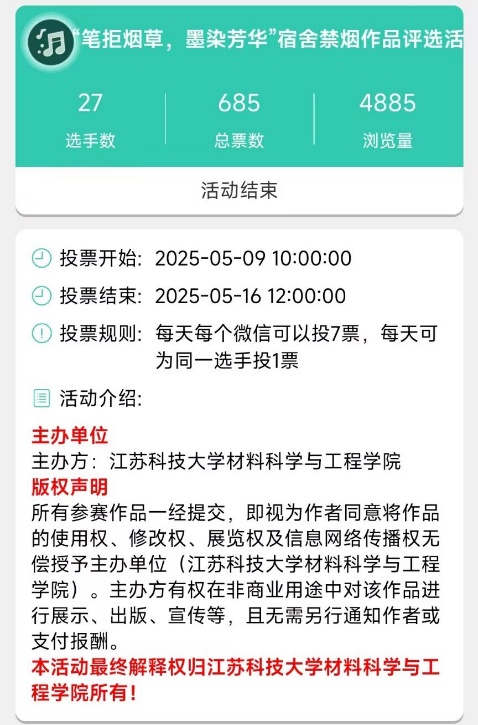 4月1日至29日,学院成功举办"笔拒烟草,墨染芳华"宿舍禁烟主题作品征集大赛。活动面向全院学生征集短视频、绘画、手工艺等多元艺术作品,共收到参赛作品27件。其中一部5分钟动画短片以奇幻叙事手法生动展现吸烟危害,引发广泛共鸣。参赛作品通过艺术展览形式在网上公开展示,累计吸引近5000人次浏览,有效扩大了禁烟宣传的影响力。