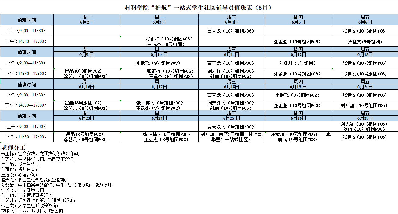 材料学院“护航”一站式学生社区辅导员值班表(6月)