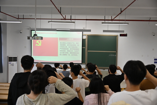 随后,功能材料系研究生党支部全体党员同志们重温入党誓词。重温入党誓词环节作为送别活动的重要部分,既是对毕业生党员的一次深刻党性教育,也是对在校党员的精神洗礼。铿锵有力的誓言在会场回荡,彰显着全体党员们坚定的理想信念和使命担当。