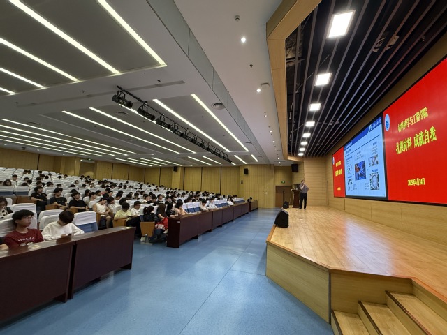 朱治愿研究员分别从“专业理解与职业规划”、“角色转变与自我成长”、“材料学科与专业特色”三个方面跟2024级同学交流了学好专业的重要性。朱教授首先从“未来路在哪?”“如何去定位?”“从事什么职业?”三个方面解答大一同学目前存在的困惑。同时结合几个案例跟同学们交流了材料在国民经济和国家支柱产业中的重要性,“一代材料、一代器件、一代设备”阐述了推进未来材料产业发展的重要性。
