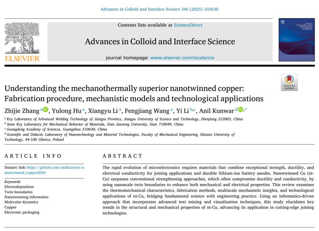 近日,我校材料科学与工程学院张志杰老师与西安交通大学和波兰西里西亚理工大学合作,以江苏科技大学为第一单位在期刊《Advances in Colloid and Interface Science》(中科院一区,影响因子19.3)上发表题为“Understanding the mechanothermally superior nanotwinned copper: Fabrication procedure, mechanistic models and technological applications”的综述性论文。