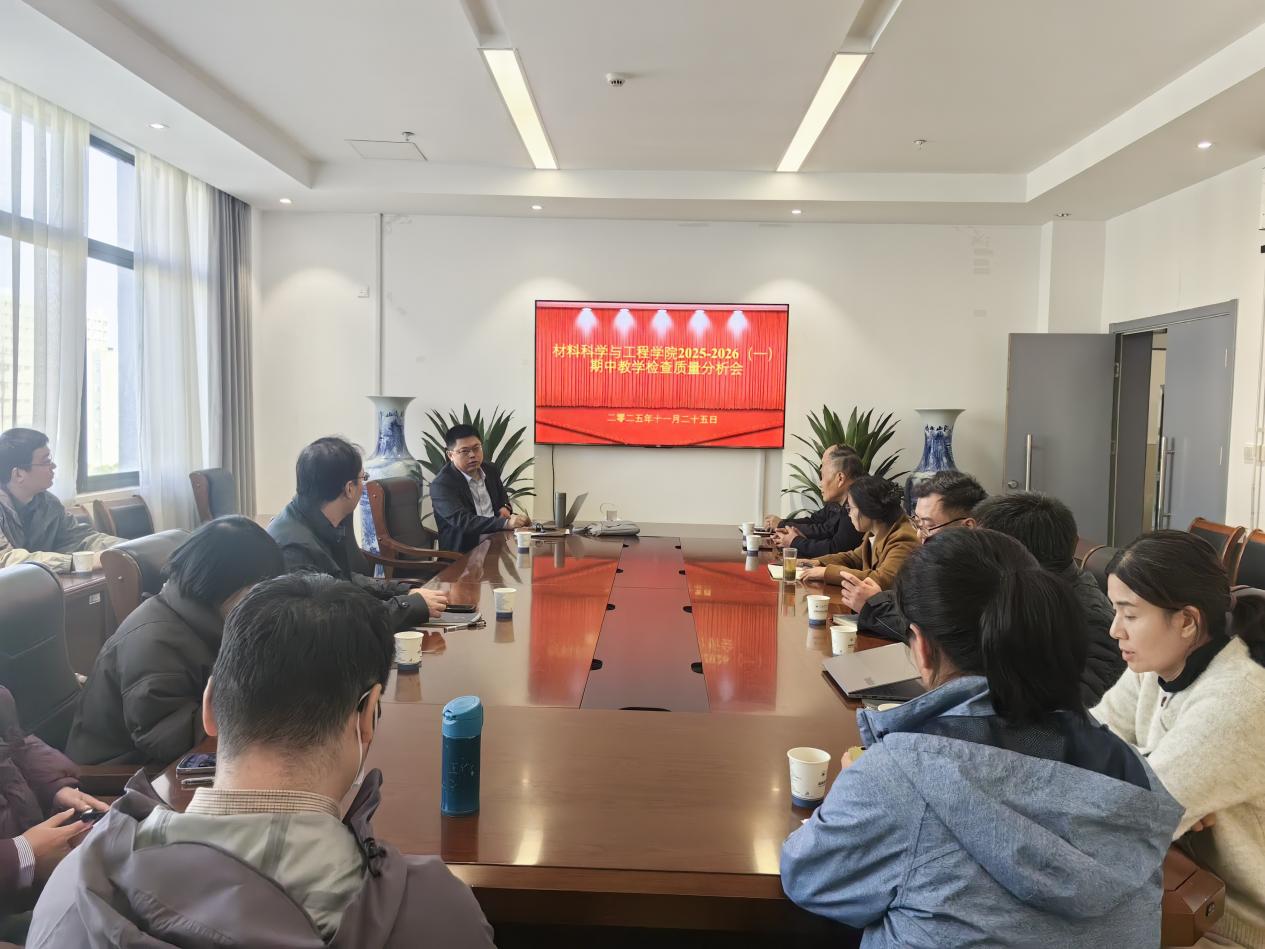 为全面复盘教学工作成效,精准破解教学痛点,持续提升人才培养质量,11 月 25 日,材料科学与工程学院召开 2025-2026 学年第一学期期中教学检查质量分析会。会议由赵勇副院长主持,杨海涛副书记、各系主任、专业负责人、督导组组长、实验室主任、教师代表及教务办、学工办相关人员参会。