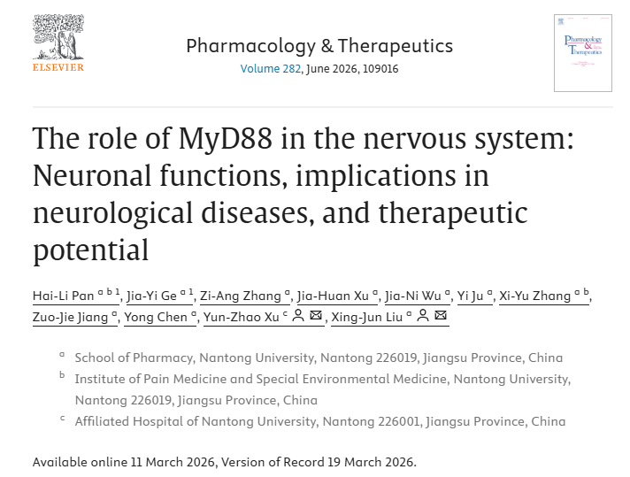 近日,药学院刘兴君教授、特种医学研究院潘海莉教授、附属医院徐云钊教授应邀在国际期刊《Pharmacology and Therapeutics》上发表题目为“The Role of MyD88 in the Nervous System: Neuronal Functions, Implications in Neurological Diseases, and Therapeutic Potential”(MyD88在神经系统中的作用:神经元功能、在神经系统疾病中的意义及治疗潜力)的综述论文,系统阐述了MyD88蛋白在免疫信号通路和中枢神经系统(CNS)中的研究进展,并重点阐述了其在CNS疾病如阿尔茨海默病(AD)、帕金森病(PD)、肌萎缩侧索硬化(ALS)、脑中风和颅脑损伤等,以及慢性疼痛中的功能和潜在的治疗作用。