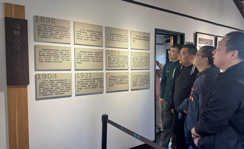 虞楼始建于1921年,由张謇先生为缅怀恩师翁同龢所建,承载着深厚的师生情谊与爱国情怀,是传承师道精神、弘扬优良学风的重要载体。参观过程中,药学院党委书记姚春雷介绍了张謇与翁同龢的师生故事,带领全体教师感悟二人实业救国、教育救国的初心使命与高尚品格。