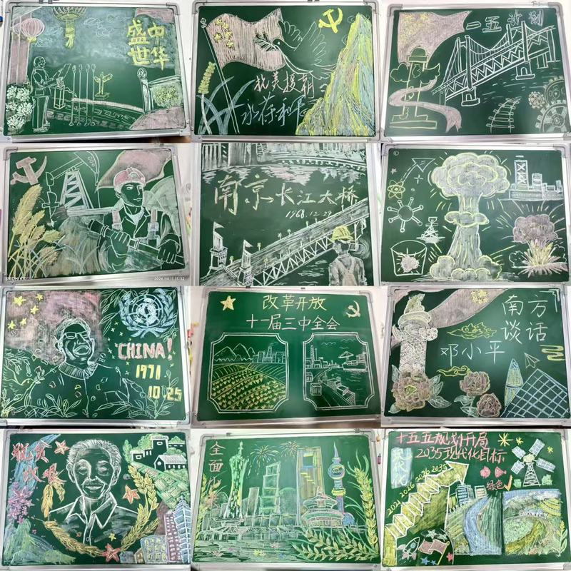 活动现场,大家共同回顾了党和国家77年的光辉奋斗历程。从开国大典的庄严宣告、“一五”计划的坚实奠基,到联合国席位的合法恢复;从改革开放的扬帆启航、港澳回归的血脉归根、到世贸组织的深度融入;从脱贫攻坚的全面胜利、卡脖子技术的重大突破,再到“十五五”规划的开局奋进,一幅幅生动的粉笔画串联起国家发展的重要节点。同学们在绘写中接受感恩教育,在回望中感受时代脉搏。姚婧怡、沈子茗同学结合自身画作分享感悟,展现出药学院青年心系家国、昂扬奋进的精神风貌。
